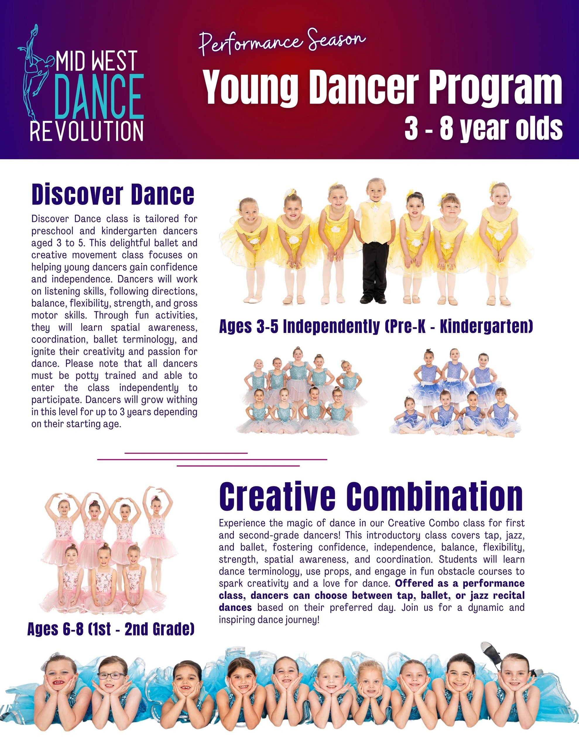 Our non-competitive Core Dance classes, designed for dancers aged 8 and up, offer a professional and technically focused experience. Featuring ballet, jazz, tap, hip hop, and acrobatics, these classes build a solid foundation for any dancer looking to advance their skills, confidence, and artistry in an enriching and reputable environment.